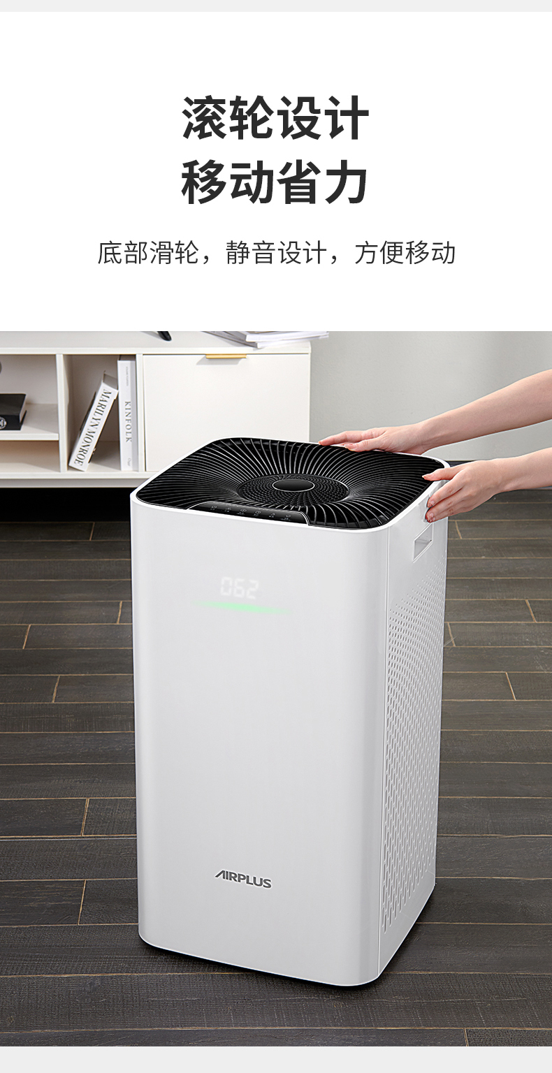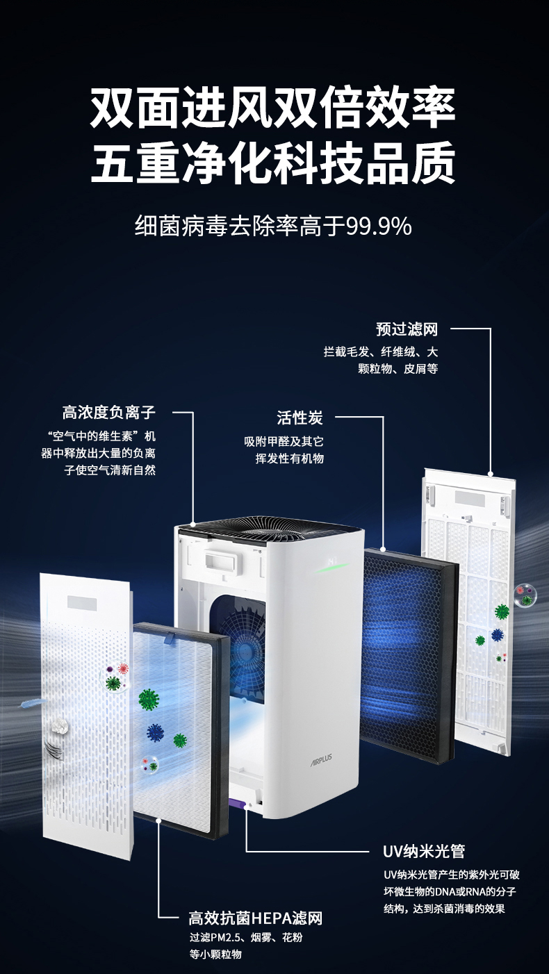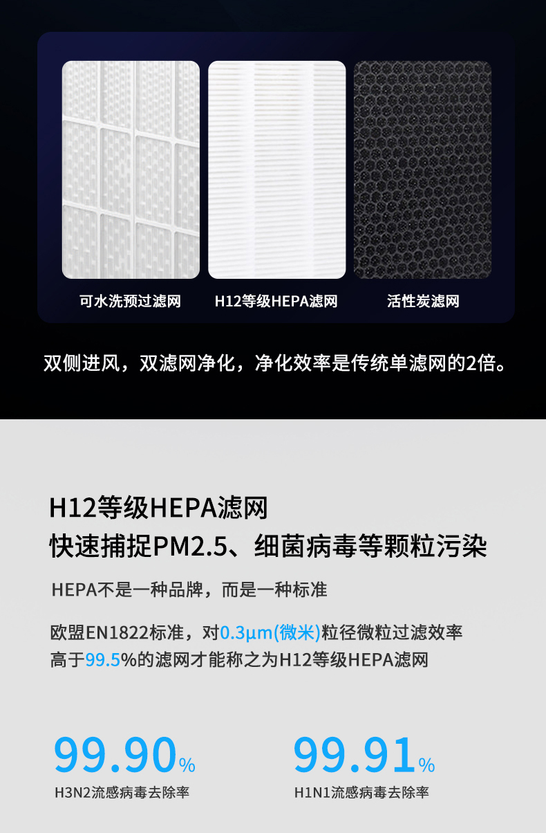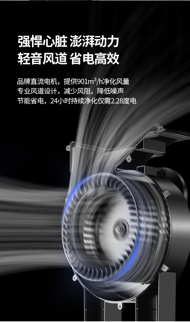 双面进风,双倍效果错步式涡轮结合扇叶黄金出风角,出风更稳定高效,360度全方位净化